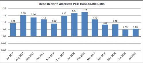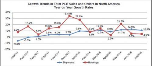 2018年7月份北美PCB總出貨量,與去年同期相比,增長了10.8%;年初至今的發(fā)貨量高于去年同期10.5%。與上個(gè)月相比,7月份的出貨量減少了19.1%。