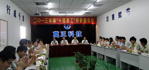 2013年7月23日下午一點整,公司培訓室里人員濟濟一堂,正在召開的2013年度“十佳員工”表彰座談會,不時掌聲陣陣。會議由行政保密部經(jīng)理葉秀華主持,參加座談會的有2013年度“十佳員工”及“表揚人員”,各部門課長以上人員。出席本次表彰座談會的嘉賓有公司副總經(jīng)理王德瑜、總經(jīng)理助理徐正保、工會主席丁麗敏和婦代會主席倉瑋。