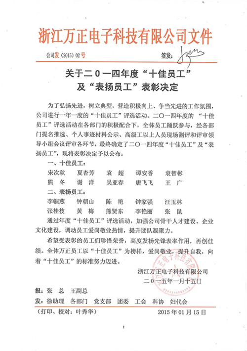關于二O一四年度“十佳員工”及“表揚員工”表彰決定