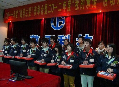 在會議上,行政保密部經理葉秀華宣讀了《關于2011年度“踐諾之星”的表彰決定》。在音樂聲的陪伴下,生產計劃部經理劉忠明、快板生產線經理李軍依次為大家送上了沉甸甸的水晶獎杯和獎品。晶瑩剔透的獎杯見證了他們2011年度踐諾工作所付出的努力,今天他們又將踏上嶄新的踐諾之行。接著,各位踐諾之星為大家交流了2011年度踐諾總結,并許下了2012年度承諾。現場掌聲一次又一次響起,他們的行動深深感染了在座的每一位員工。劉經理高度贊揚了他們的工作表現,同時他也對大家的年度工作提出了自己的期望。婦代會負責人倉瑋表示,大家都要向踐諾之星學習,腳踏實地,踐行承諾。
