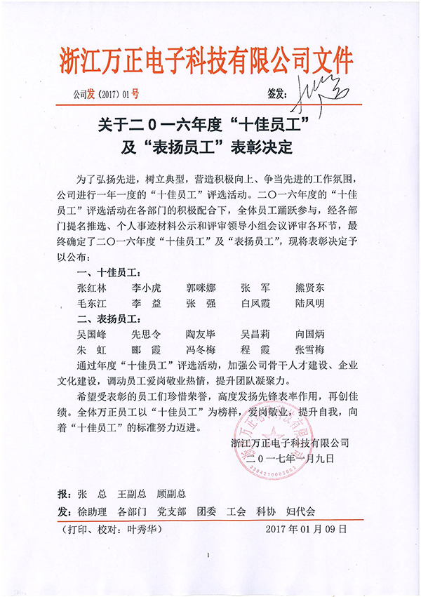 關于二O一六年度“十佳員工”及“表揚員工”表彰決定