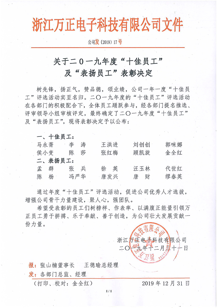 關于二O一九年度“十佳員工”及“表揚員工”表彰決定