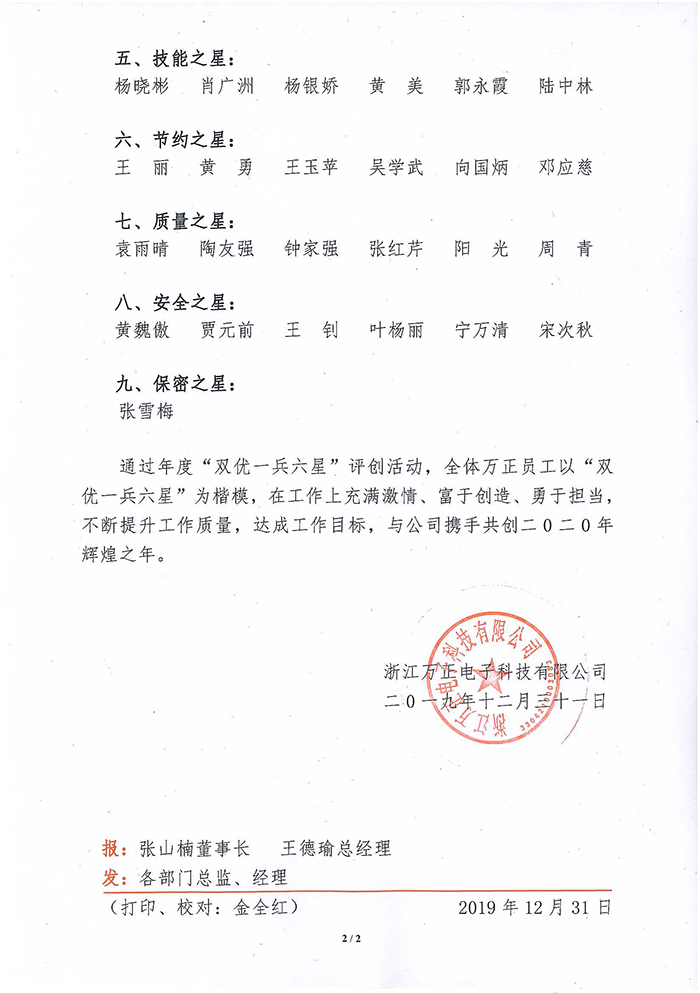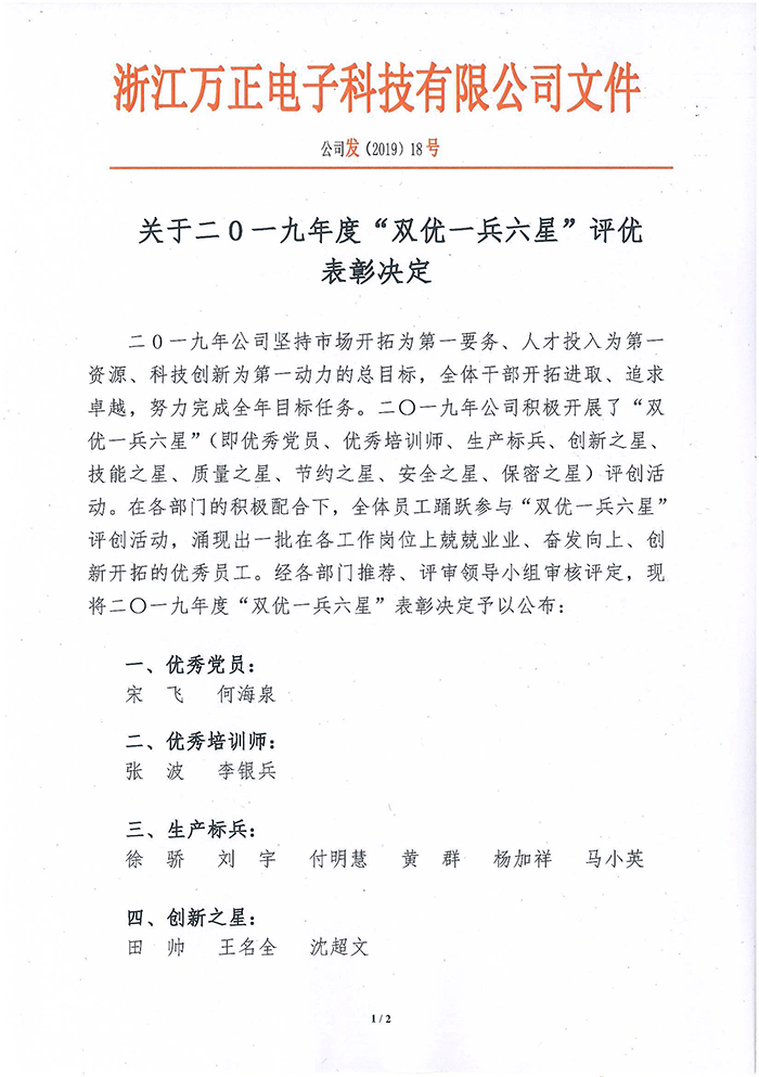 關于二O一九年度“十佳員工”及“表揚員工”表彰決定