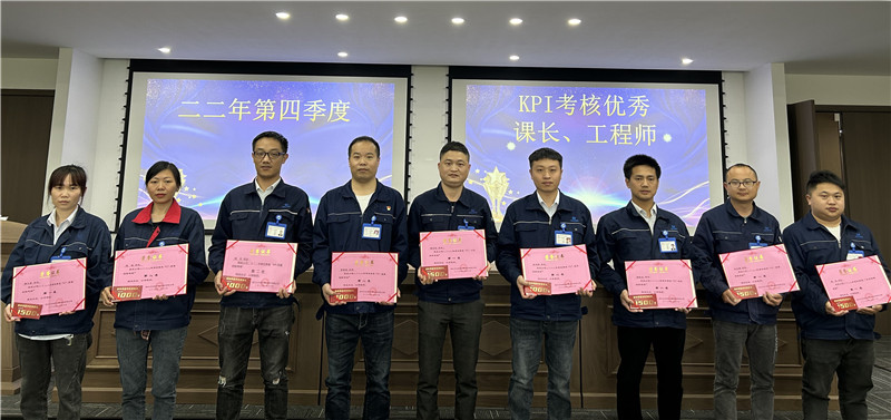 首先舉行二O二二年第四季度評優表彰會,表彰會上共表彰了KPI考核優秀課長及工程師14名、KPI考核優秀組長及員工12名、優秀合理化方案提案及實施者12項、內控工作先進者2名,分別頒發榮譽證書和獎金。