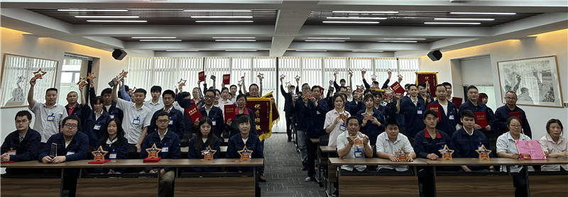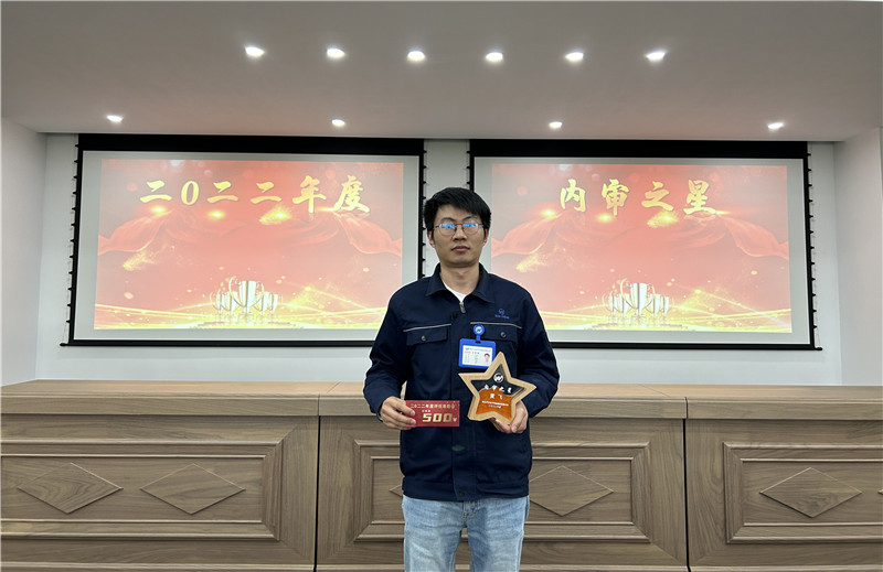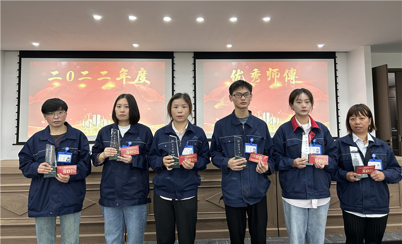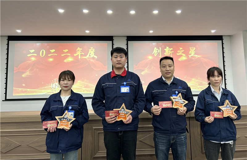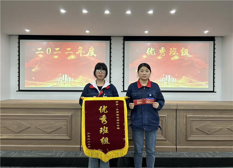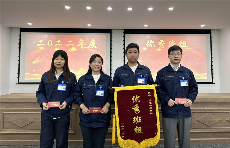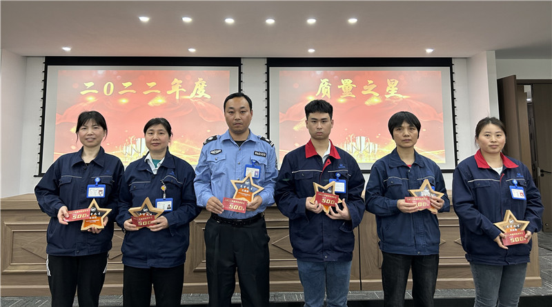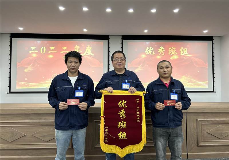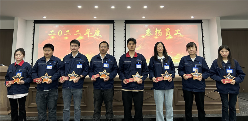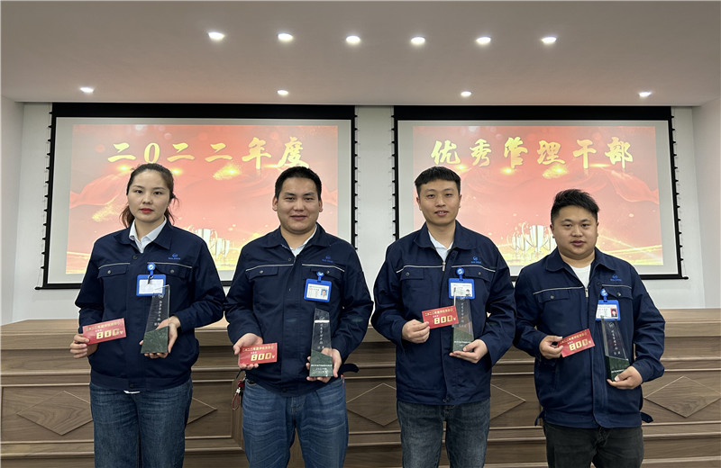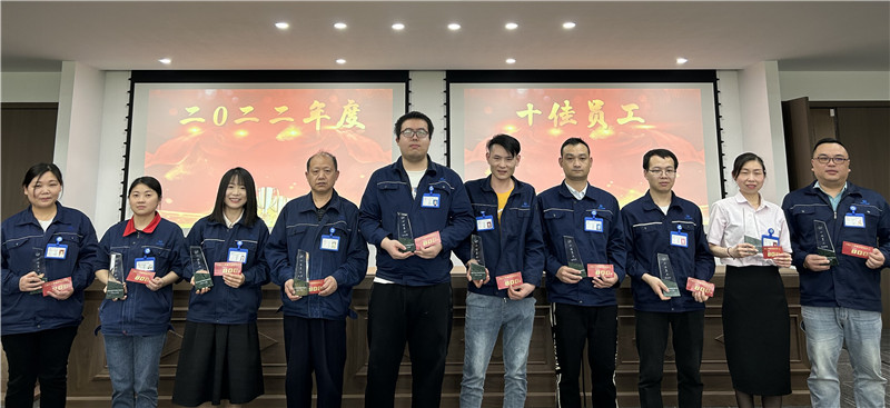接著舉行二O二二年年度評優表彰會,表彰會上共表彰了十佳員工10名、表揚員工10名、優秀黨員2名、優秀管理干部5名、優秀班組4組、創新之星4名、內審之星1名、優秀師傅6名、保密之星1名、節約之星5名、技能之星6名、質量之星7名、安全之星6名,分別頒發獎杯、錦旗和獎金。