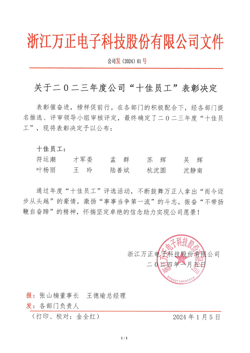 關(guān)于二0二三年度公司“十佳員工”表彰決定