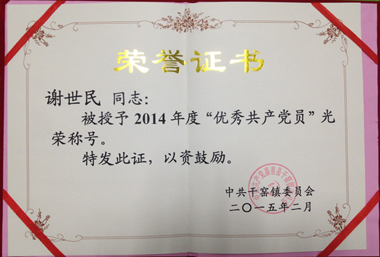 熱烈祝賀我公司謝世民同志被中共干窯鎮委員會授予2014年度“優秀共產黨員”光榮稱號