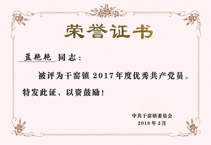 熱烈祝賀我公司孟艷艷同志被中共干窯鎮委員會授予2017年度“優秀共產黨員”光榮稱號